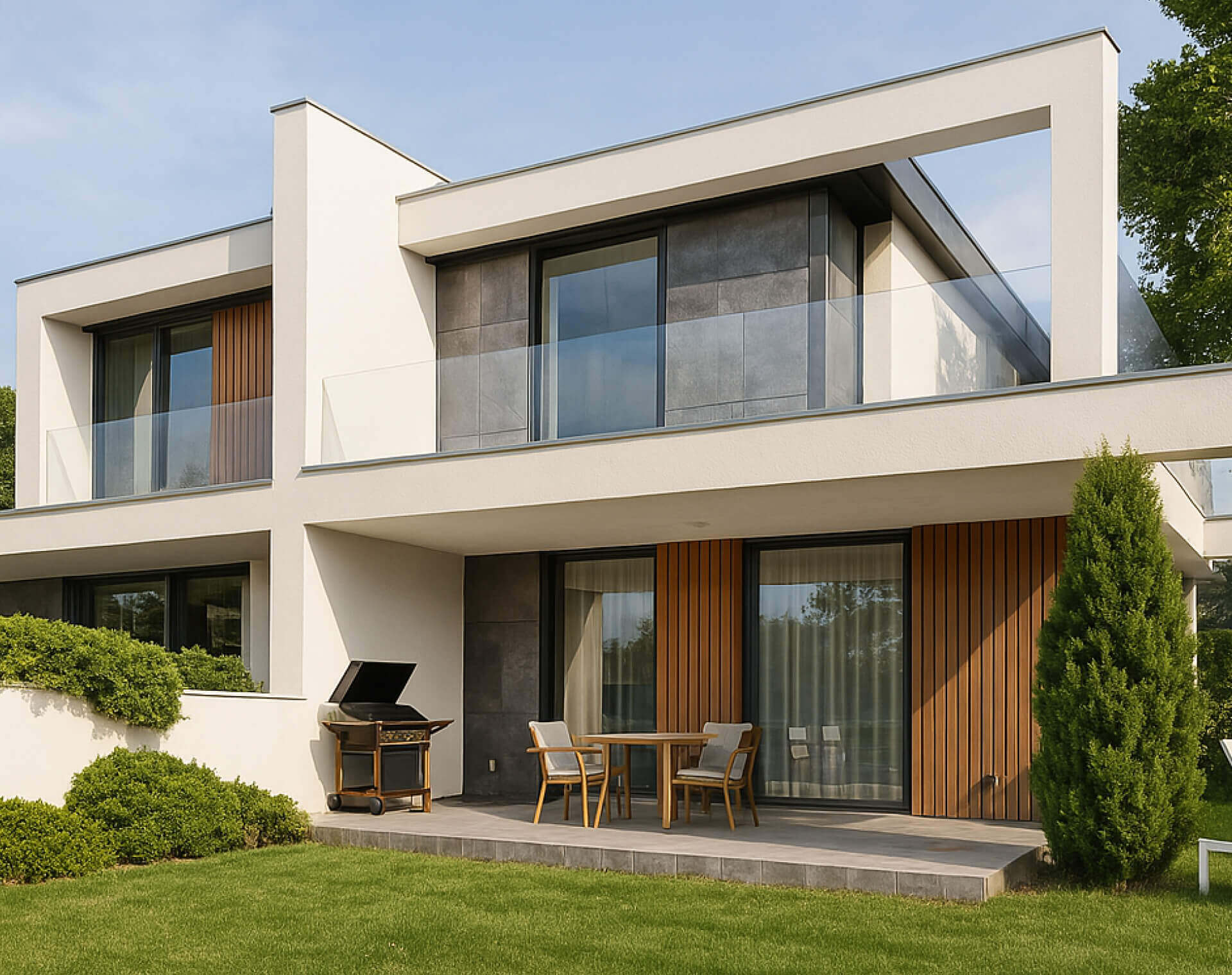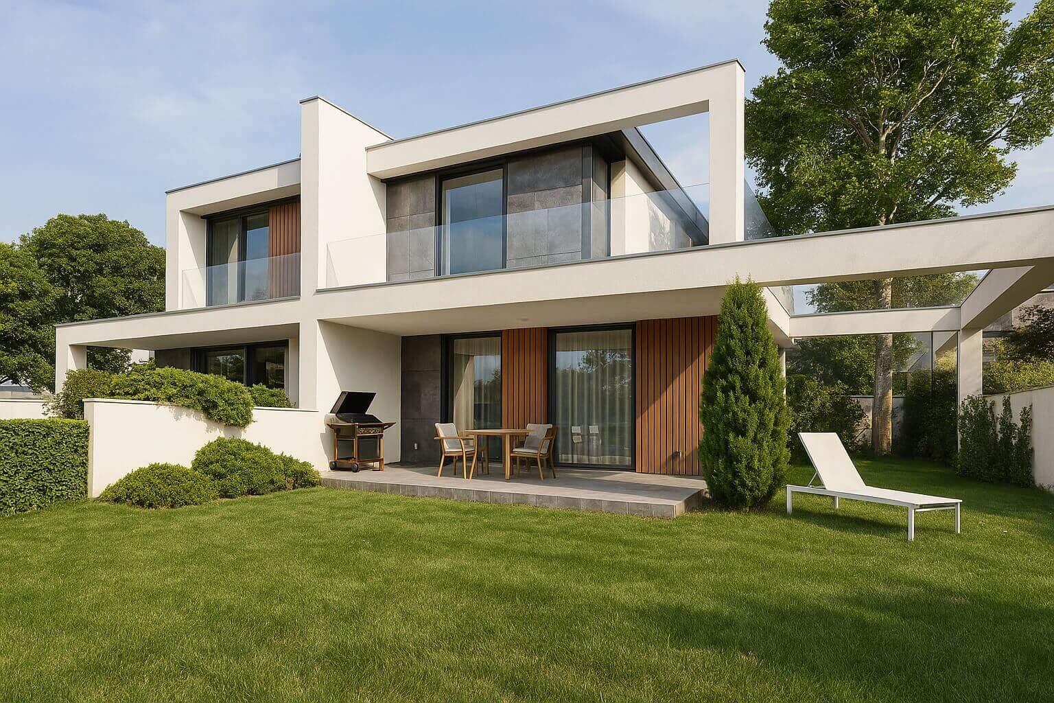 Folosirea elementelor din beton alb, lemn și sticlă creează un contrast elegant și contribuie la estetica premium a locuințelor. Suprafețele vitrate generoase permit iluminarea naturală abundentă și o legătură fluidă între interior și exterior.